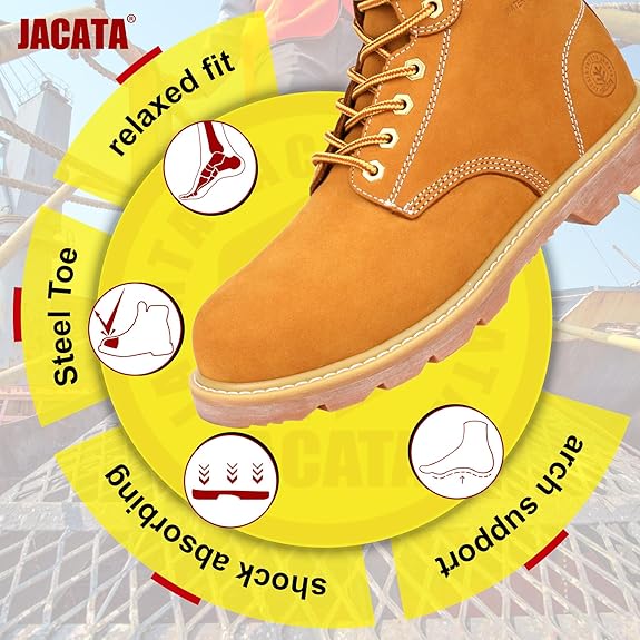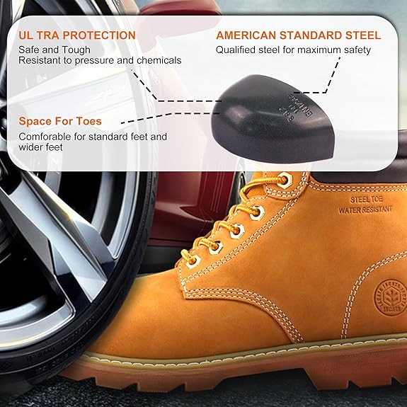 Steel Toe Boots For Men : Steel toe inside,which can provide protection from impacts of up to 200 joules.No more worrying about being injured,punctured or crushed by heavy,hard or angular objects falling on your toe.This steel toe construction safety work boot delivers protection,comfort and durability to support you work throughout the day.