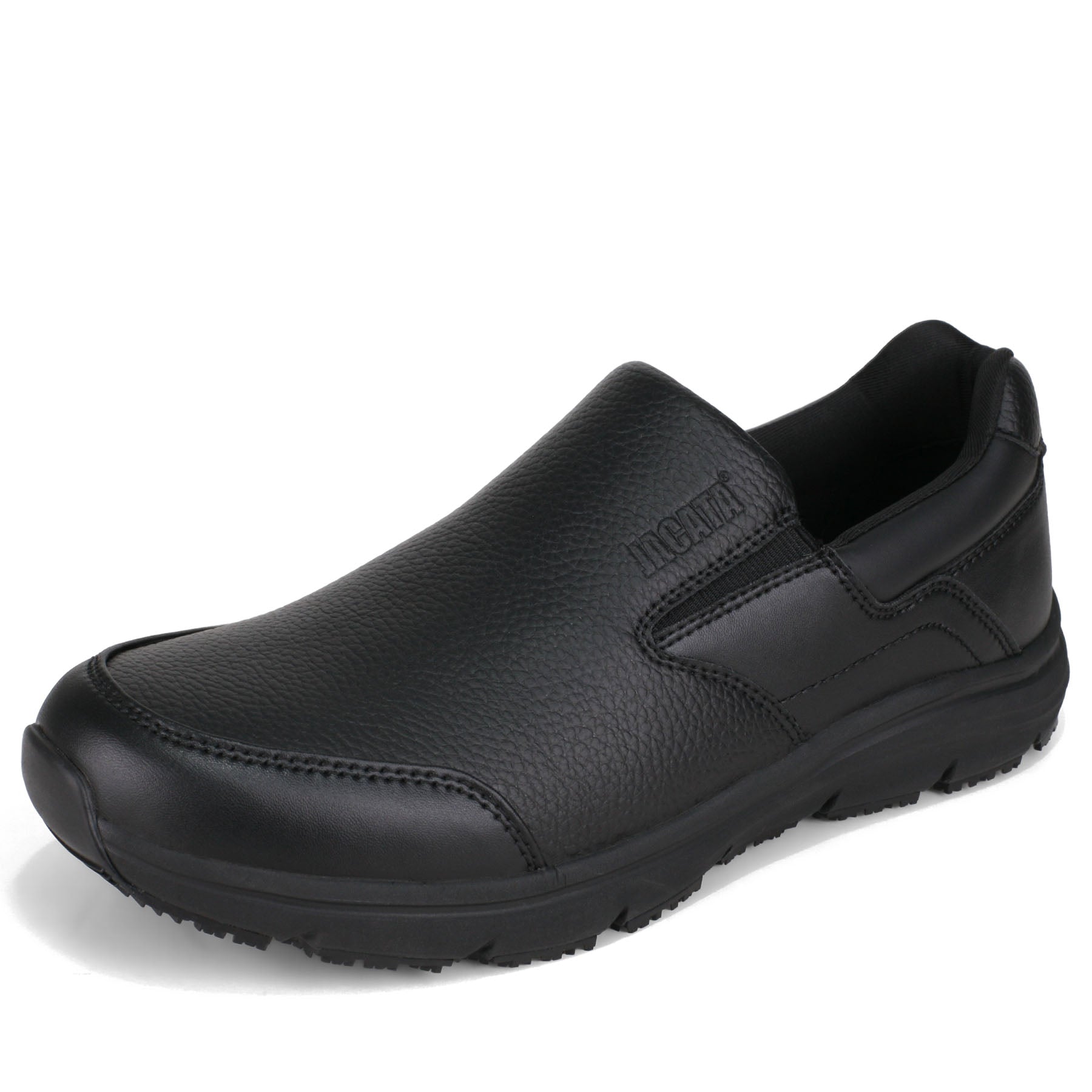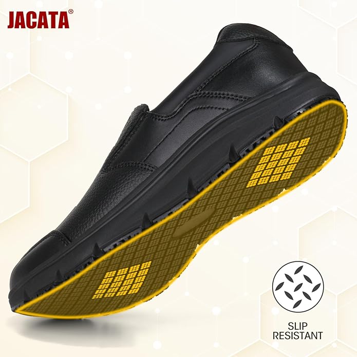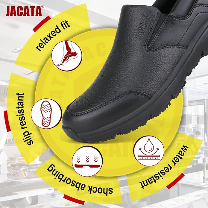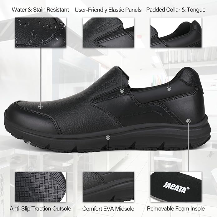 - COMFORTABLE WORK SHOES FOR MEN : Jacata Black shoes for men EVA midsole have flexibility, fatigue resistance and shock absorption. Enjoy reduced strain on your body. The removable foam insole of our non slip for men food service is padded with a cushioned foam to provide support and comfort for long shifts on your feet.