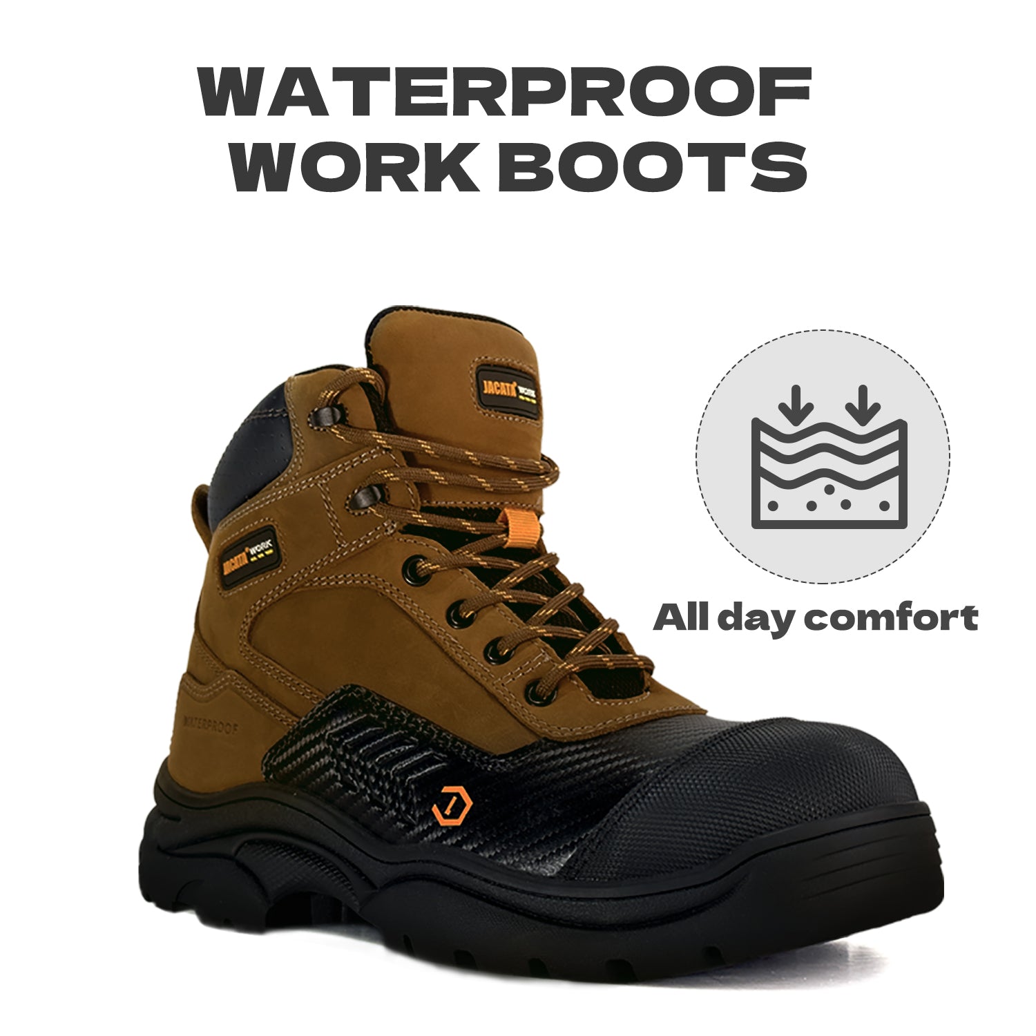 - Waterproof Pure Natural Leather : This Jacata work boots upper is made of soft pure natural leather, perfect blend of strong and soft with no break in period lets . Make this mens work boots more comfortable and durability . keep your feet dry, promote air flow and circulation. the moc toe wedge boots be your perfect partner
